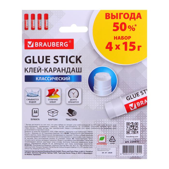 Клей-карандаш BRAUBERG гарантирует надежное склеивание бумаги, картона и фотобумаги. Идеально подходит для офиса, дома и школы. Единица товара - блистер (15 г х 4 тубы). Выгодный формат!После нанесения высыхает без образования пятен. Не токсичен, не вызывает аллергии и безопасен для здоровья. Легко наносится и распределяется по поверхности, оставляя тонкий и ровный клеевой слой, что позволяет расходовать его экономично. Клей удобен в использовании. Он не пачкает руки, стол, одежду, не попадает на участки бумаги, расположенные возле места склеивания. Увеличенный срок годности — 5 лет.