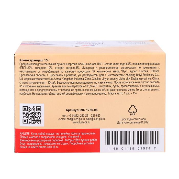Клей-карандаш PVP 15 г Луч «Школа творчества» — Характеристики