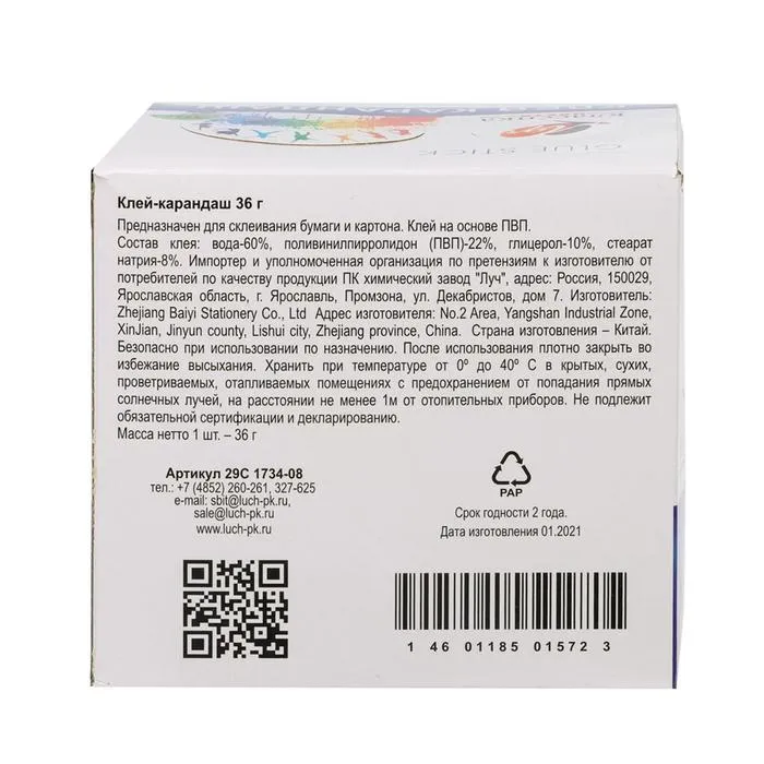 Клей-карандаш PVP 36 г Луч «Классика» — Характеристики