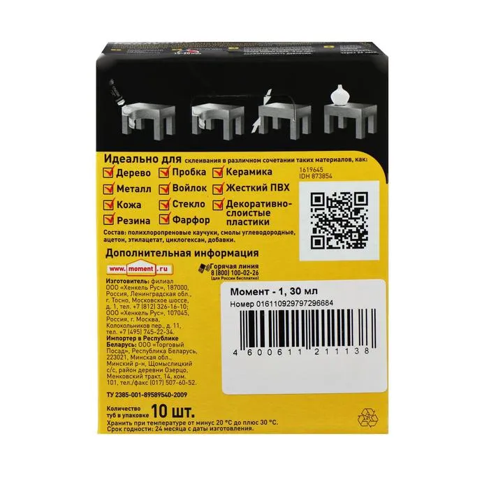 «Момент-1» предназначен для склеивания в различном сочетании между собой дерева, металла, кожи, резины, войлока, стекла, керамики, фарфора (кроме посуды, контактирующей с пищей). На конечный результат влияет не время выдержки поверхностей, а сила давления. Перед работой обрабатываемый материал следует зашкурить, обезжирить и нанести клей тонким слоем на обе поверхности.