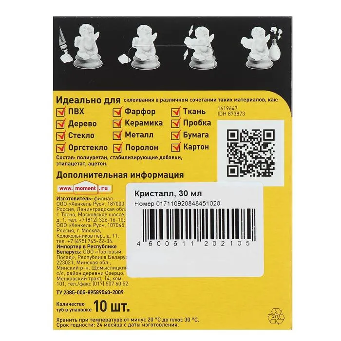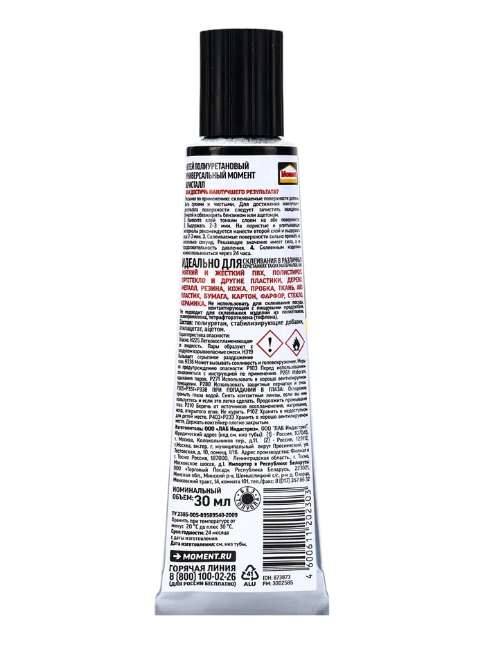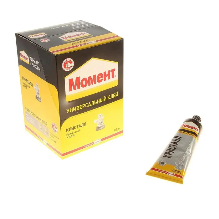 Клей Момент "Кристалл" предназначен для склеивания мягкого и жесткого поливинилхлорида, полистирола, оргстекла и других пластиков. В различных сочетаниях склеивает дерево, металл, резину, бумагу, картон, кожу, ткань, пробку, поролон, фарфор, керамику, стекло, кроме посуды, контактирующей с пищей.
