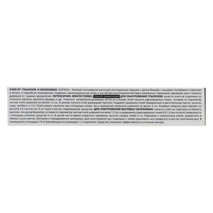 Для уничтожения грызунов: нанести клей на подложки из плотного картона, оргалита, фанеры и др. "тяжелых" материалов размером 30*20 см и более. Клей наносят равномерным слоем, оставив по периметру чистые поля шириной не менее 1,5 см. В центре липкого слоя размещают кусочки пищевой приманки (хлеб обжаренный в растительном масле, кусочек сыра, колбасы и т.п.). Клей можно наносить как сплошным слоем, так и замкнутой полоской шириной не менее 5 см. Клеевые ловушки расставляют из расчета 3-5 листов на 10 м² пола в местах перемещения грызунов.