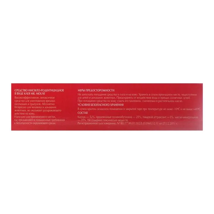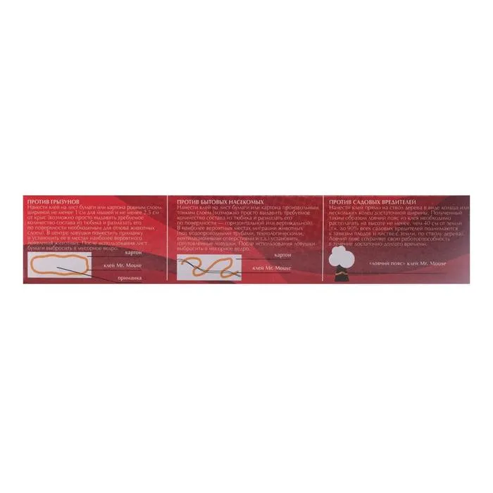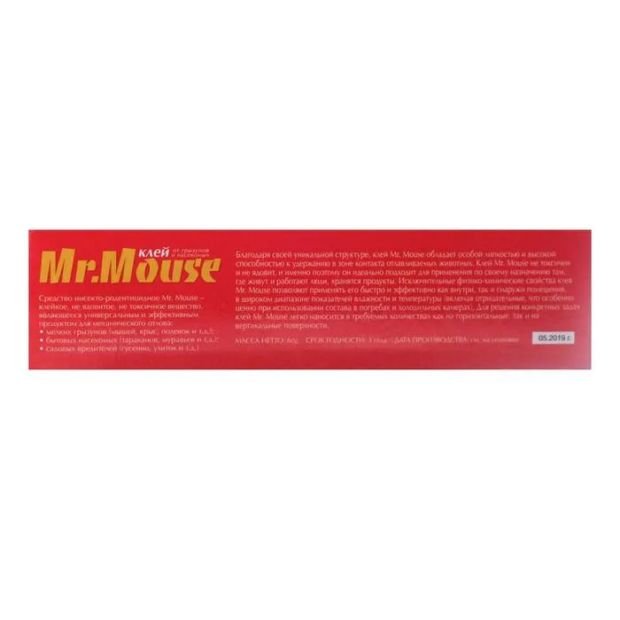 Клей от мышей, крыс и других насекомых является отличным средством в борьбе с насекомыми (тараканами, муравьями и пр.) и домашними грызунами (мышами, крысами, полевками), а так же принцип действия данного клея является одним из самых оптимальных средств для отлова вредителей. В комплектации: клей Mr.Mouse и подробная инструкция к применению. Данное средство не содержит токсических и химических веществ, которые могли бы вызвать реакцию у человека или домашних животных, поэтому его можно применять даже на кухне и в ванной комнате. Ловушки следует расставлять в местах предполагаемого обитания грызунов — возле стен, непосредственно возле нор и в труднодоступных углах квартиры.