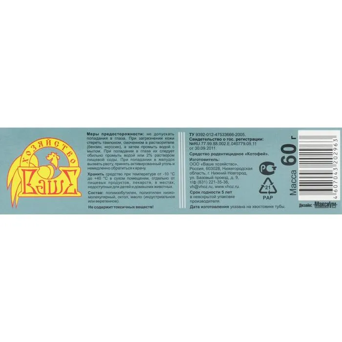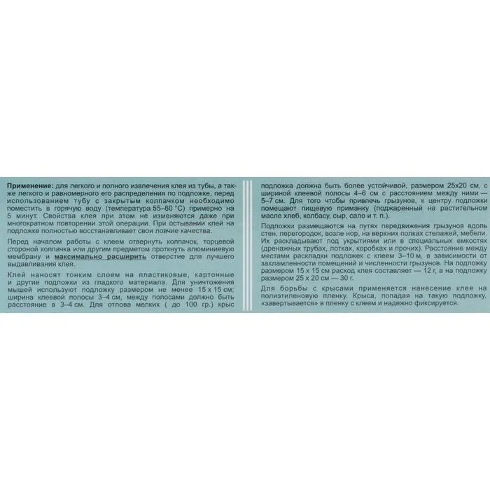 Клей ''Котофей'' - нетоксичное средство для отлова и уничтожения мышей и мелких крыс. В некоторых случаях применение отравленных приманок или мышеловок невозможно или нежелательно. В этом случае отличные результаты дает применение специального клея. Клей ''Котофей'' предназначен для отлова мышей и мелких крыс, обладает замечательными клеящими свойствами, надежно фиксирует ''влипших'' грызунов. Не содержит токсичных веществ, не пахнет, не отпугивает грызунов запахом. Легко наносится на подложки, имеет оптимальную консистенцию, не растекается. В ''намазанном'' виде очень, очень долгое время не высыхает, не покрывается коркой и не теряет своих свойств. Прекрасно ловит мышей как в сухих, так и во влажных помещениях, а также вне помещений. (Клеящие свойства немного снижаются лишь на морозе).