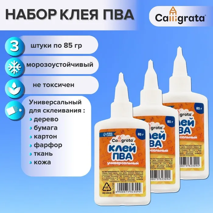 Надежный помощник в творчестве и работе с бумагой и не только. Набор ПВА с дозатором Calligrata (3×85 г) подойдет для школы, офиса и домашнего использования. Этот универсальный клей с жидкой консистенцией предназначен для склеивания бумаги, картона, дерева, ткани, кожи и фарфора.
