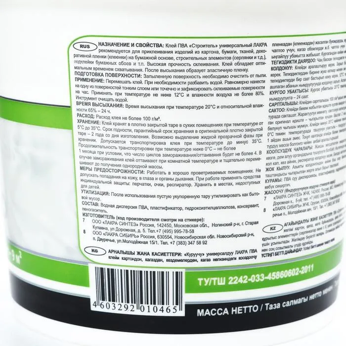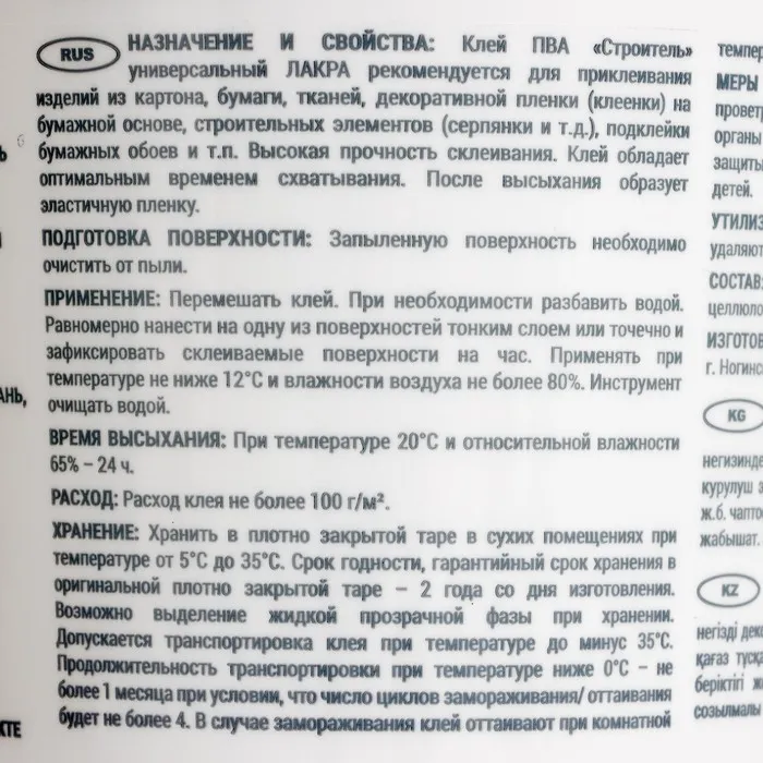 Клей на основе водной дисперсии ПВА. Обладает высокой прочностью склеивания и оптимальным временем схватывания. После высыхания образует эластичную прозрачную плёнку.