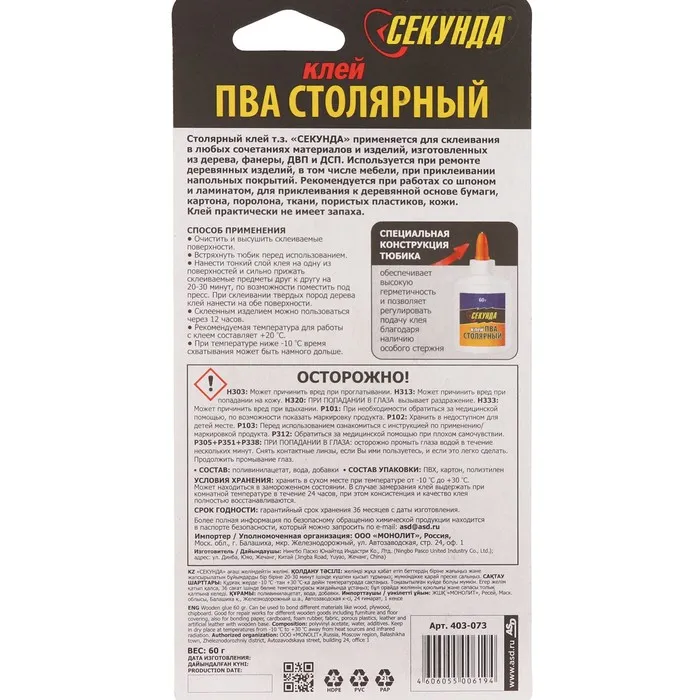Очистить и высушить склеиваемые поверхности. Встряхнуть тюбик перед применением. Нанести тонким слоем клея на одну из поверхностей и сильно прижать склеиваемые предметы друг к другу на 20 - 30минут, по возможности, поместить под пресс. При склеивании твердых пород дерева клей нанести на обе поверхности.