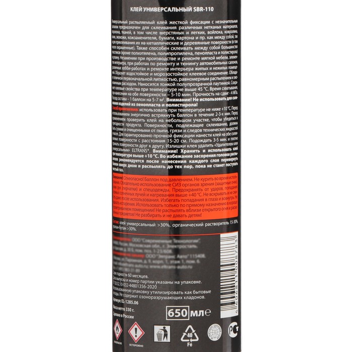 Клей универсальный Элтранс SBR=110, 650 мл, аэрозоль EL-1285.06 — Характеристики