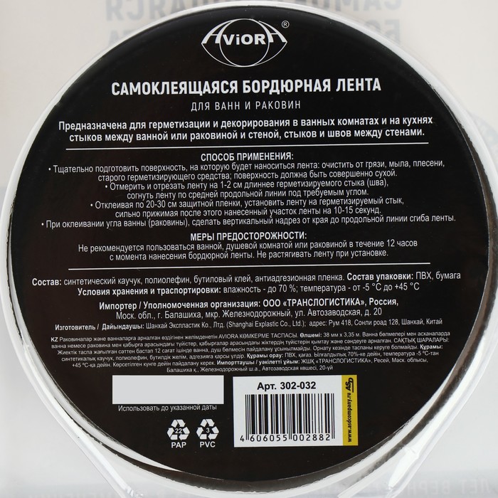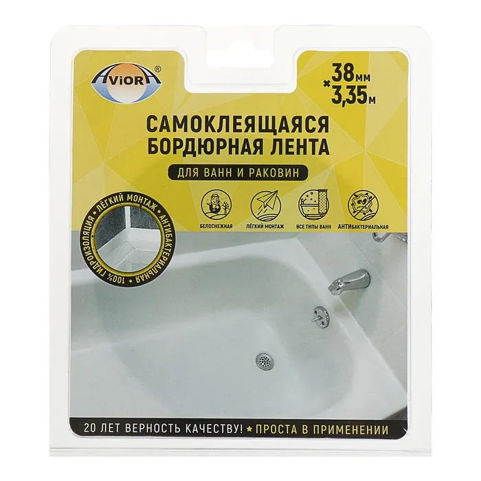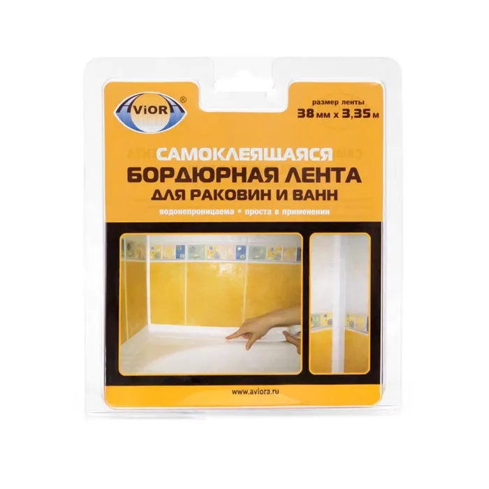 Бордюрная лента Aviora используется для герметизации стыков, для декорирования ванных комнат, душевых кабин, джакузи, кухонь. На ленту нанесен специальный бутиловый клей, который содержит добавки, препятствующие образованию грибка и плесени.