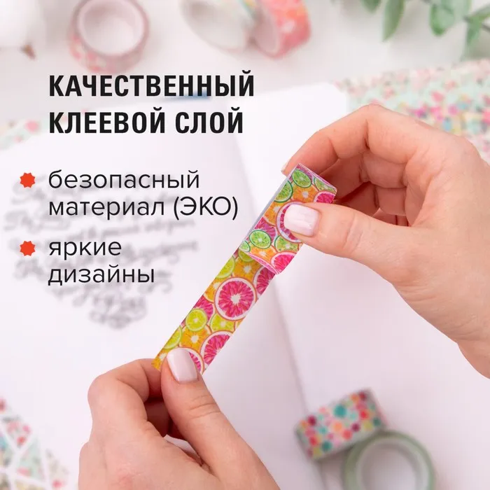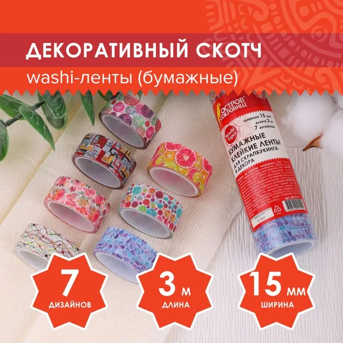 Клейкие WASHI-ленты для декора "Микс №2", 15 мм х 3 м (набор 7 шт) рисовая бумага — Характеристики