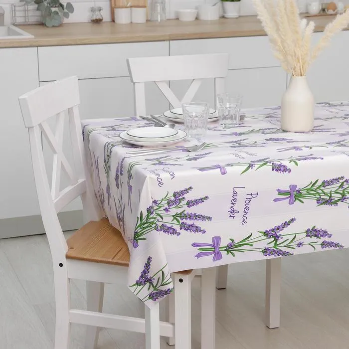 Клеёнка на тканевой основе «Лаванда» в 3–4 раза прочнее обычных аналогов. Такой материал не мнётся и не деформируется. ПВХ-основа делает клеёнку максимально простой в уходе. Любая грязь устраняется быстро: с помощью простой влажной тряпочки вы без особых усилий приведёте стол в порядок.