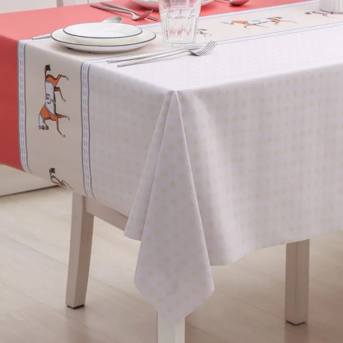 Клеёнка на тканевой основе «Скачки» в 3–4 раза прочнее обычных аналогов. Такой материал не мнётся и не деформируется. ПВХ-основа делает клеёнку максимально простой в уходе. Любая грязь устраняется быстро: с помощью простой влажной тряпочки вы без особых усилий приведёте стол в порядок.