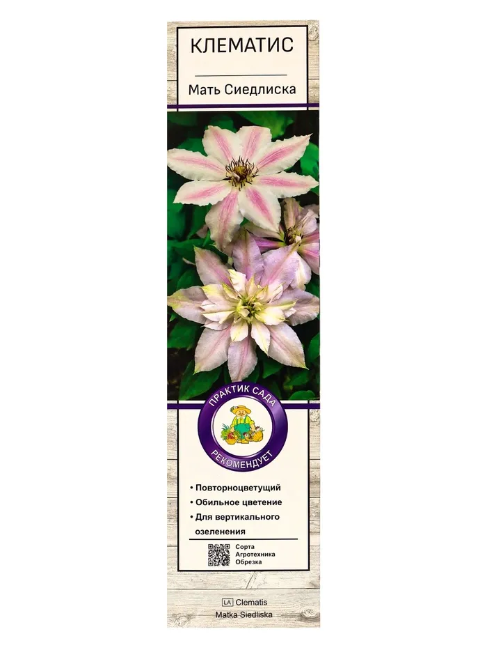 Клематис крупноцветковый Мать Сиедлиска — элегантный сорт с эффектными цветами диаметром до 15 см, окрашенными в нежно-розовый с более темным центром. Листья насыщенного зеленого цвета создают идеальный фон для ярких соцветий. Взрослое растение достигает высоты 2,5–3 метров и ширины около 1 метра. Цветение обильное и продолжительное: с июня по сентябрь. Отличительная особенность сорта — устойчивость к болезням и неприхотливость в уходе. Идеально подходит для вертикального озеленения беседок, арок, заборов или создания живых изгородей.