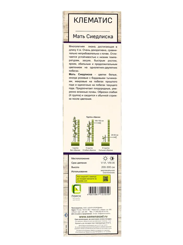 Клематис крупноцветковый «Мать Сиедлиска», туба, 1 шт. — Характеристики
