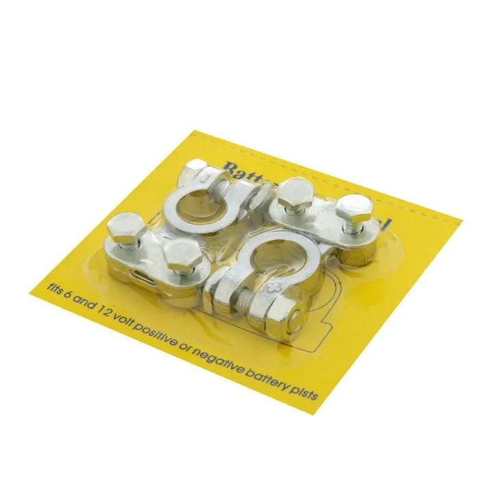 Клеммы обеспечат надежное соединение силовых проводов электропитания и аккумуляторной батареи. Имеют зажимную планку. При установке не забудьте, что плюсовой и минусовой провода следует подключить к аналогичным клеммам. Правильно подобранные зажимы гарантируют хороший контакт АКБ и проводки.