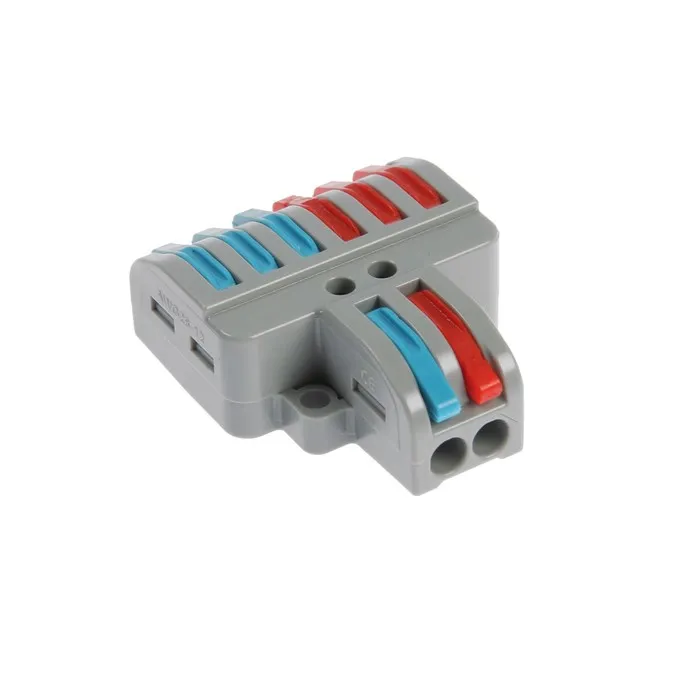 Клемма используется для подключения между собой проводов. Данные устройства позволяют произвести быстрый и безопасный монтаж токопроводящих изделий, прилагая при этом минимум усилий. Изделие содержит два разъёма ввода и шесть для вывода.
