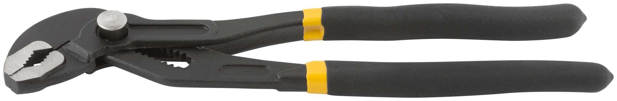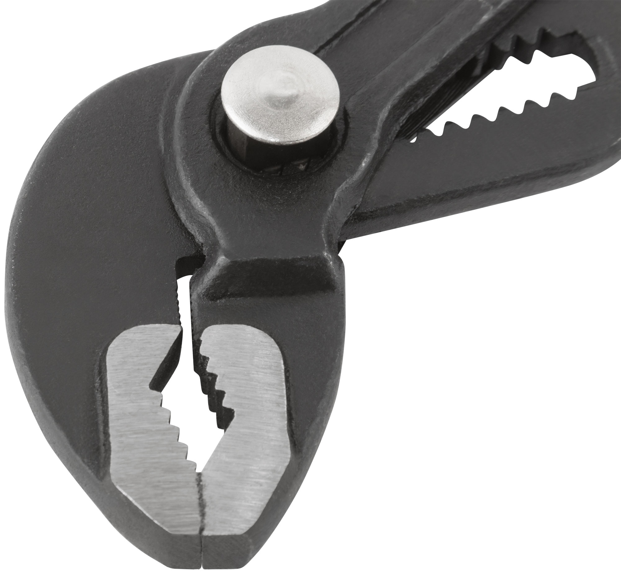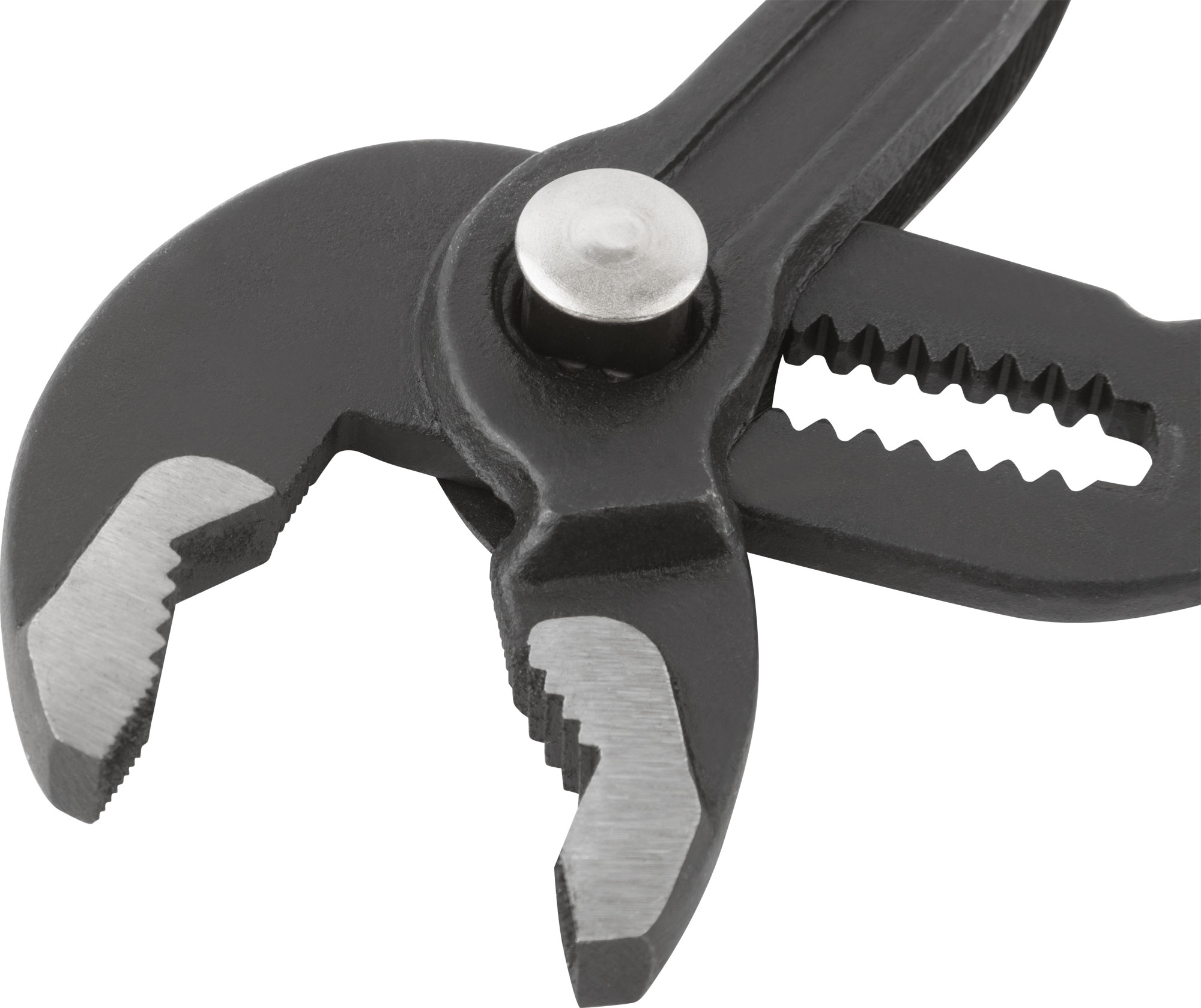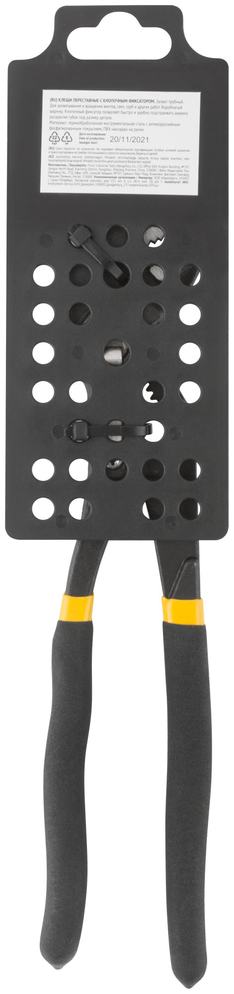 Инструмент изготовлен из высококачественной инструментальной стали с фосфатированной антикоррозийной обработкой. Кнопочный фиксатор позволяет мгновенно изменять ширину раскрытия губок, а ПВХ накладки на ручках обеспечивают комфортный хват и предотвращают скольжение.