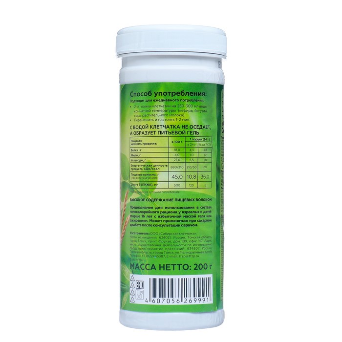 Способ употребления: 2 ст. ложки клетчатки на 250-300 мл воды комнатной температуры (кефира, йогурта, сока, растительного молока). Перемешать и настоять 3-5 мин. С водой клетчатка не оседает, а образует питьевой гель.