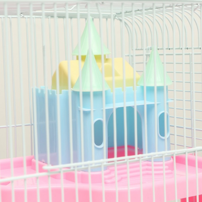 Клетка оборудована игровой площадкой с замком, в котором грызун может не только развлекаться, но и спрятаться и чувствовать себя в безопасности.