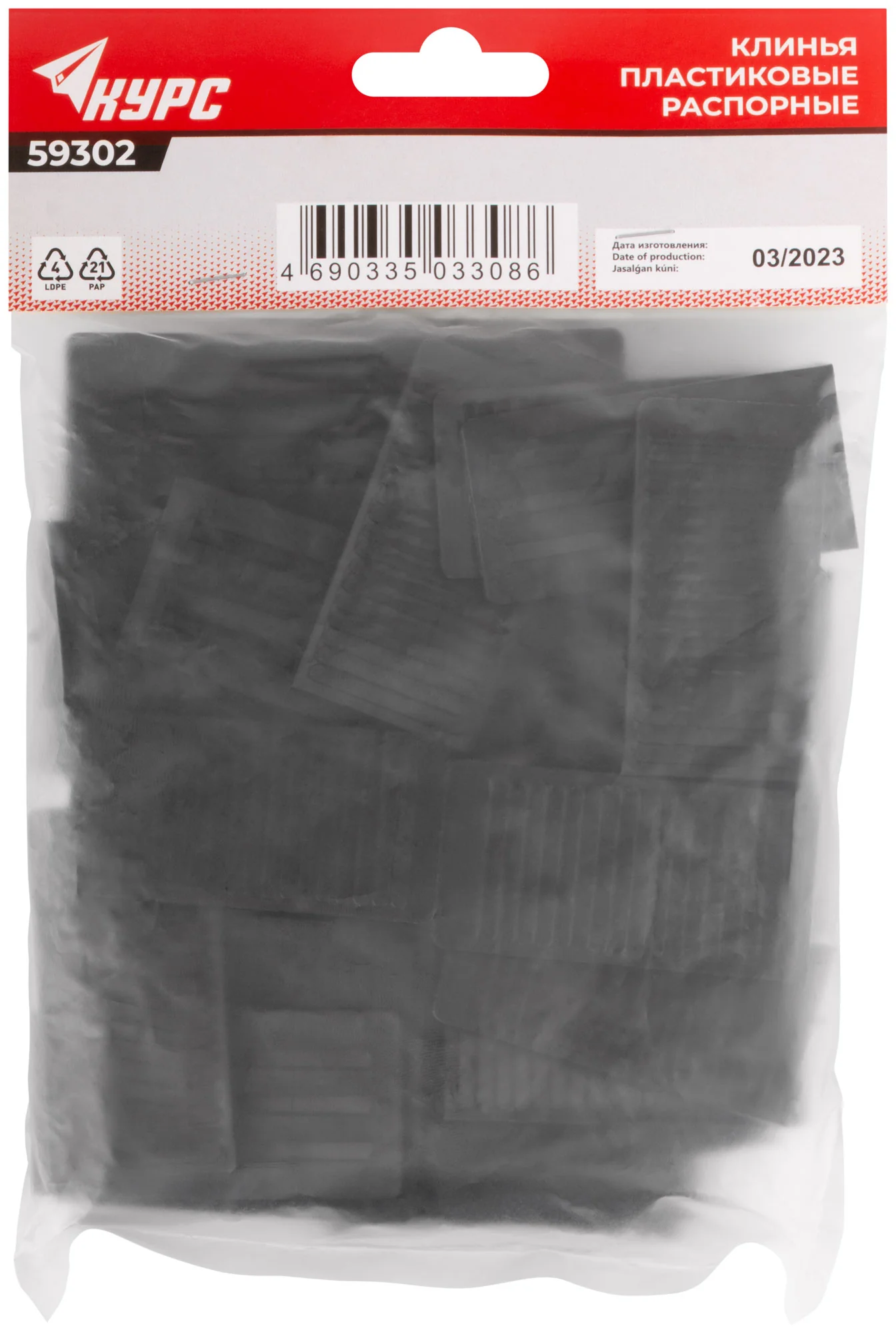 Пластиковые клинья «КУРС» произведены в Беларуси и поставляются в удобной упаковке по 30 штук. Размеры каждого клина составляют 24x14x3 мм, что позволяет легко регулировать зазор.