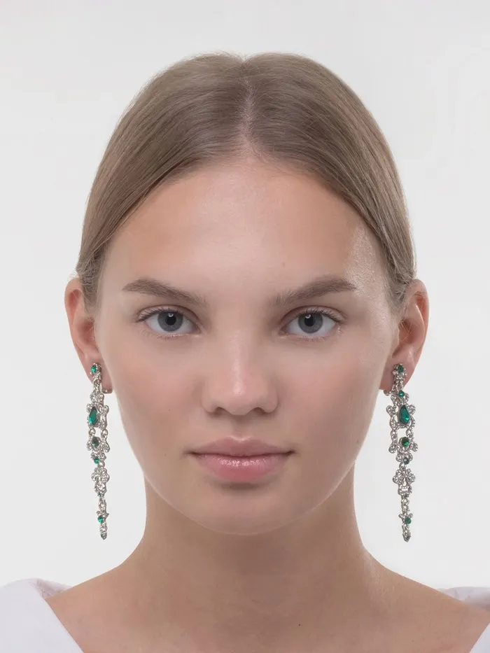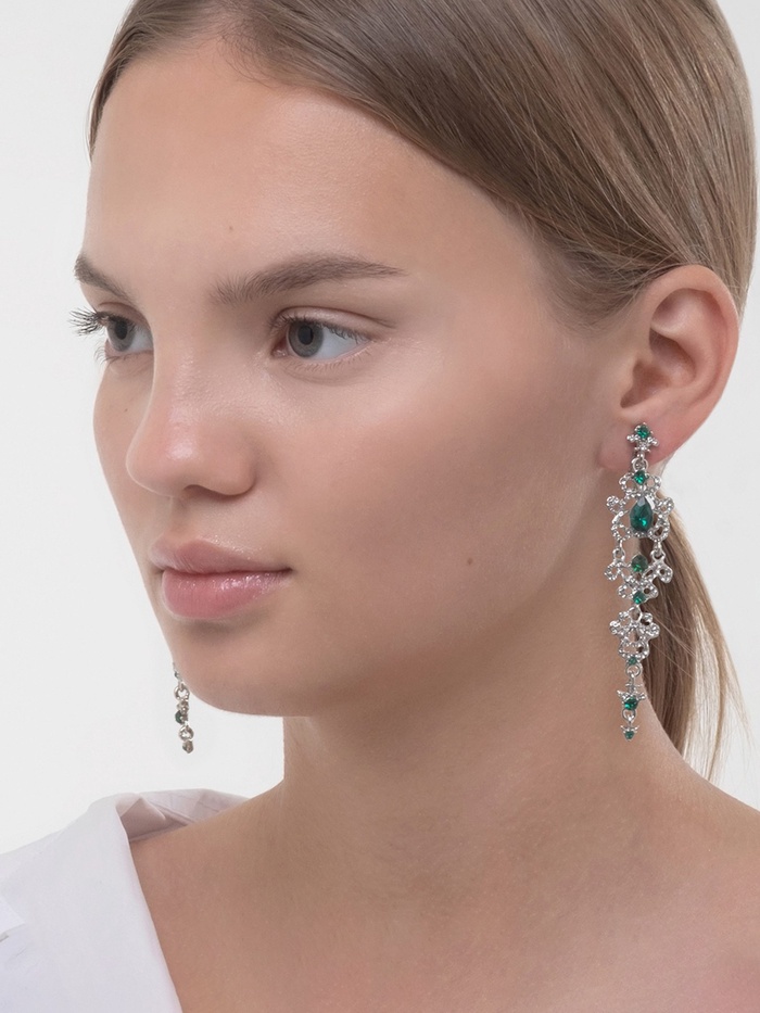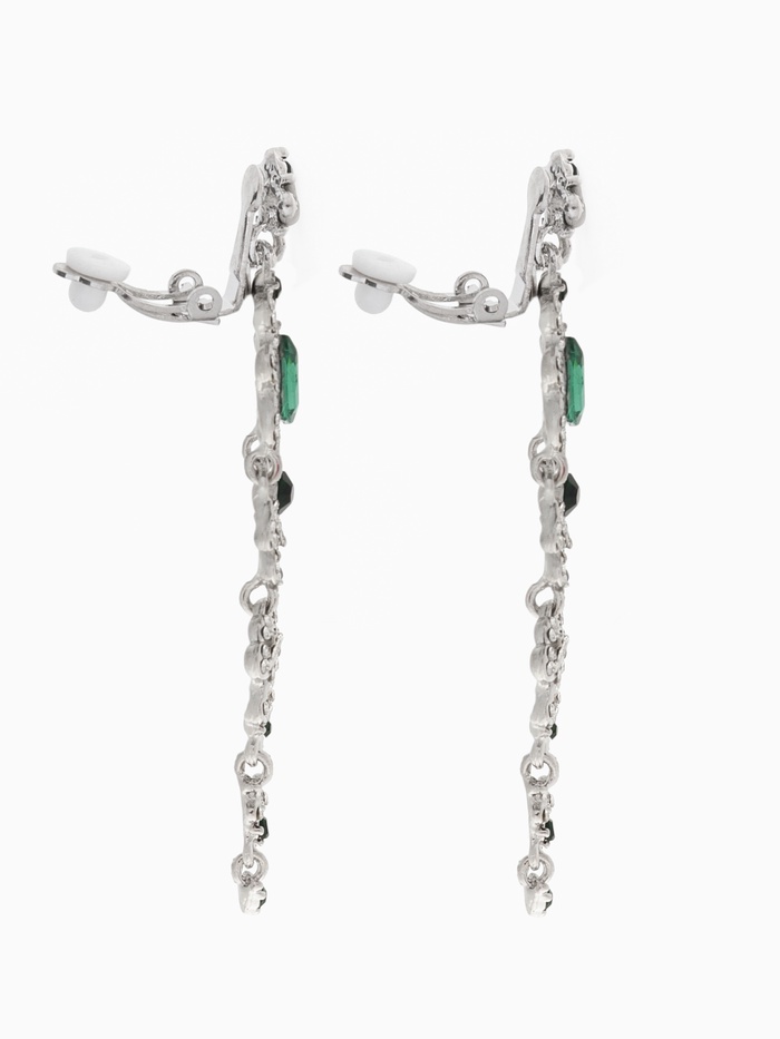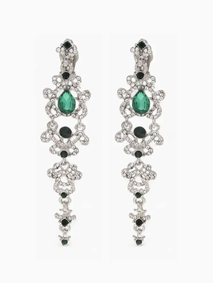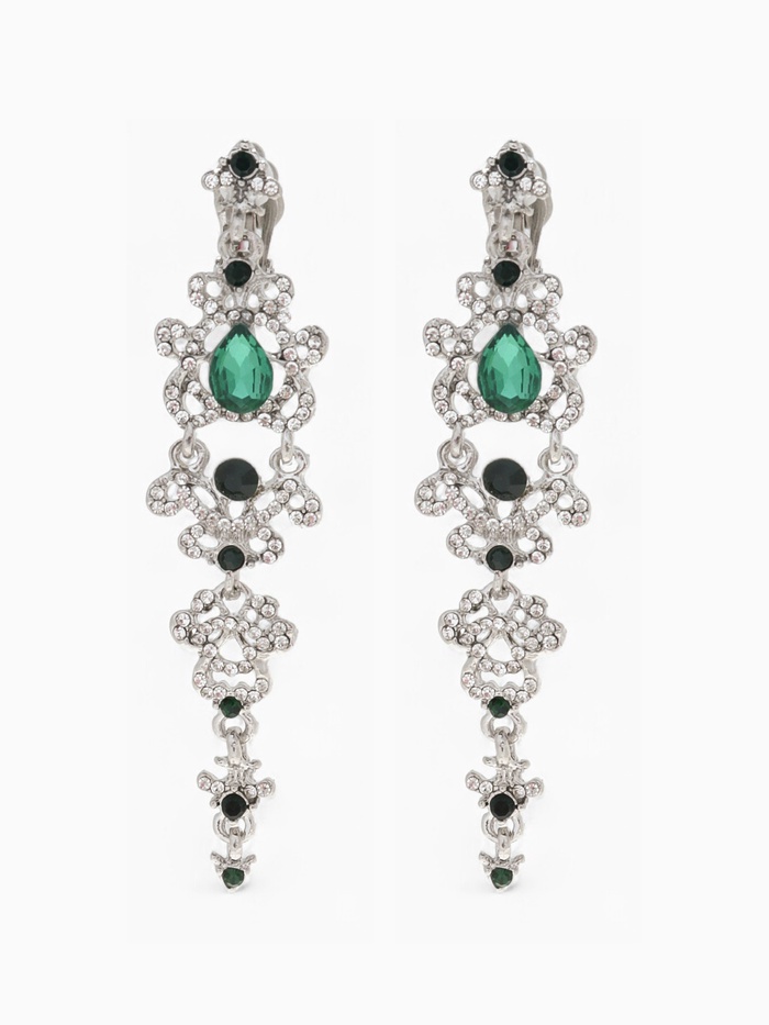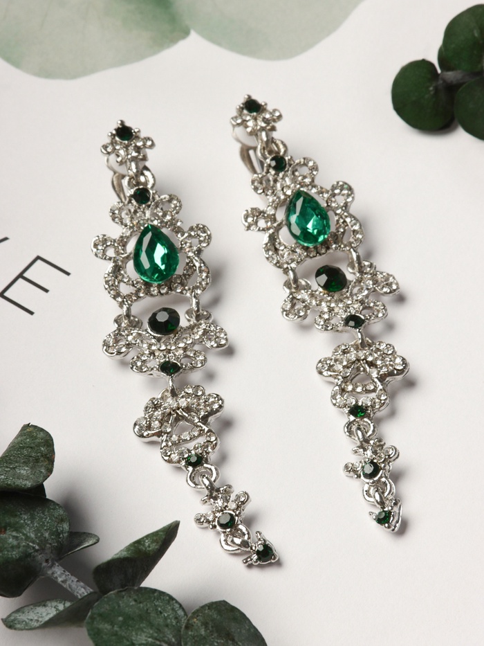 Клипсы для ушей висячие со стразами QF «Ажур», капли с завитками, цвет бело-изумрудный в серебре — Характеристики