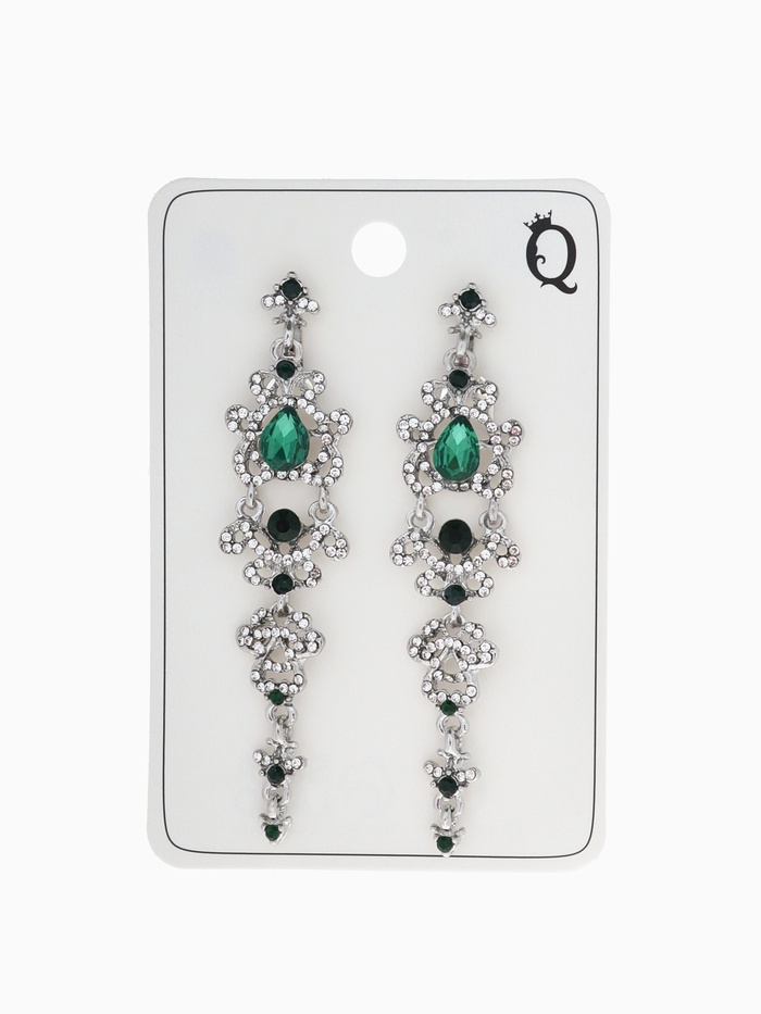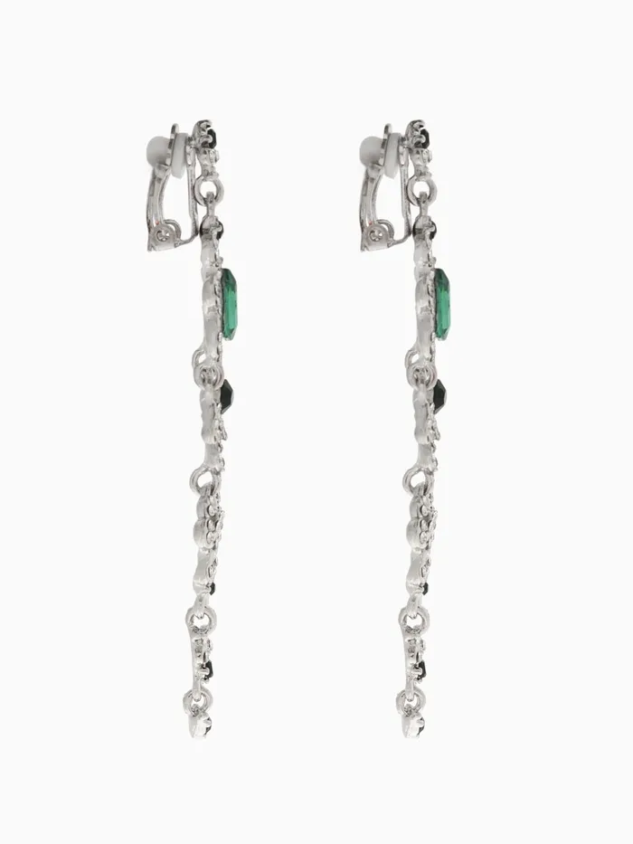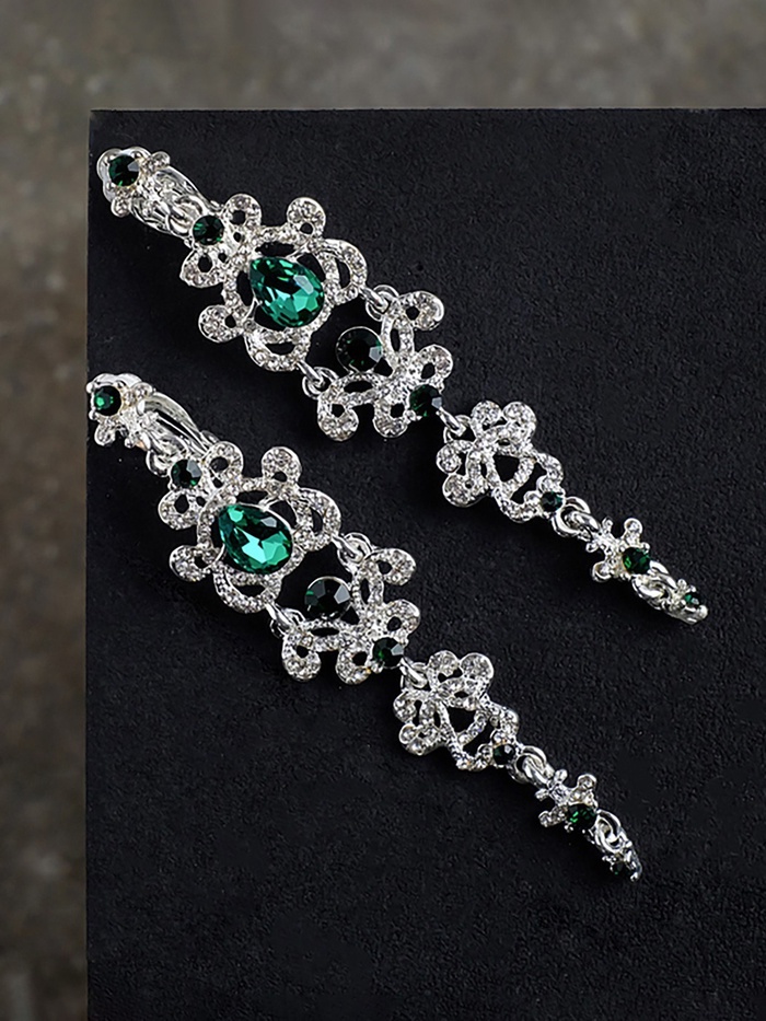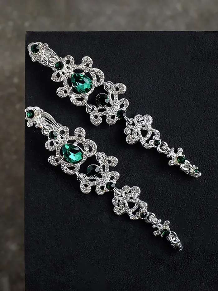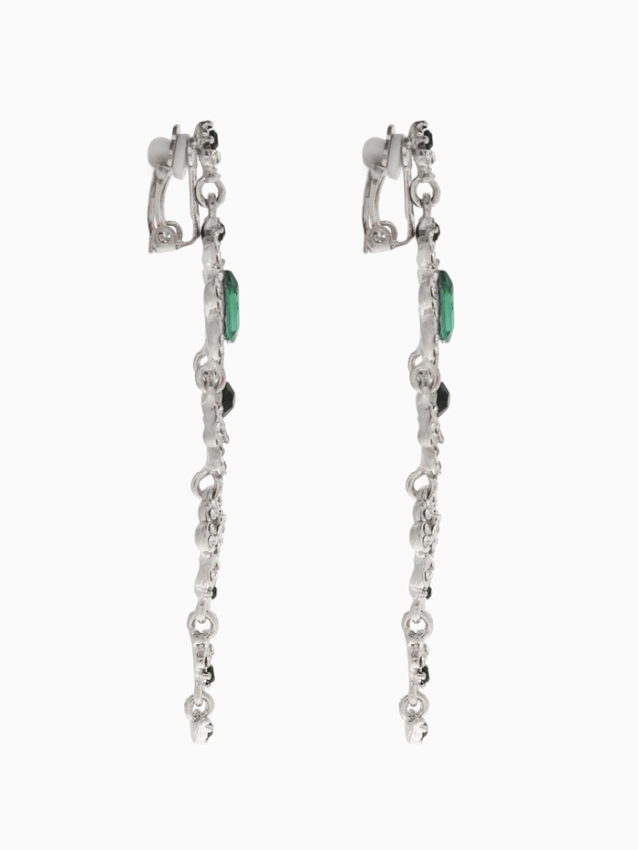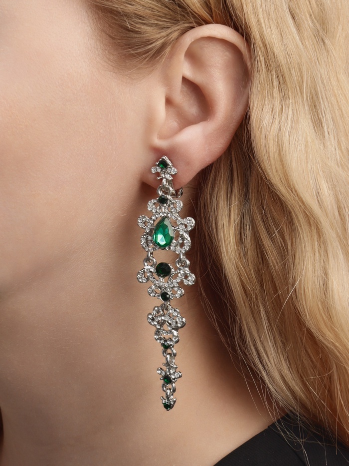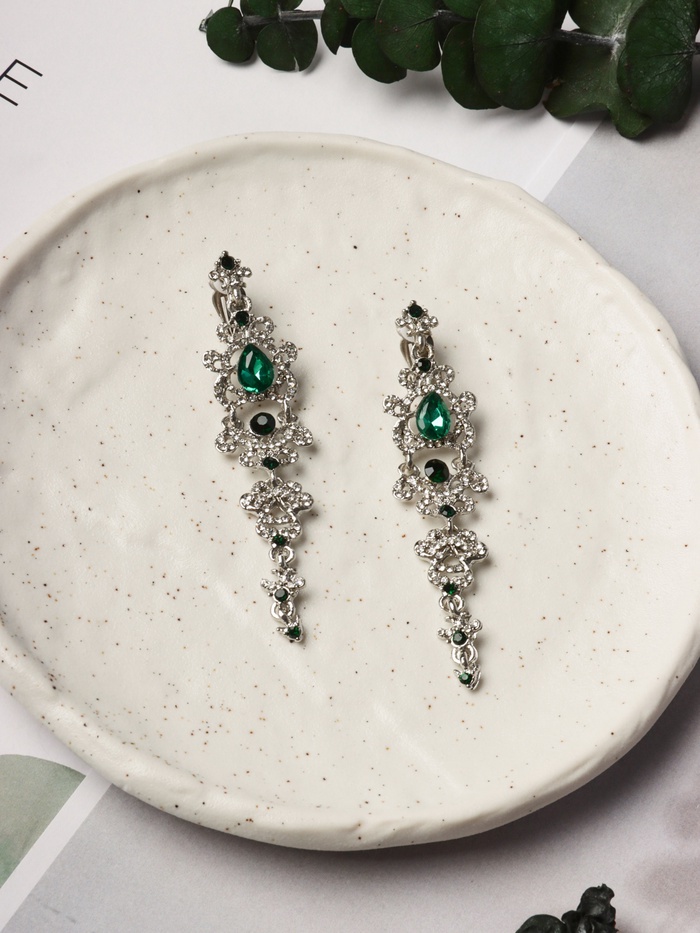 Клипсы для ушей висячие со стразами QF «Ажур», капли с завитками, цвет бело-изумрудный в серебре — Характеристики
