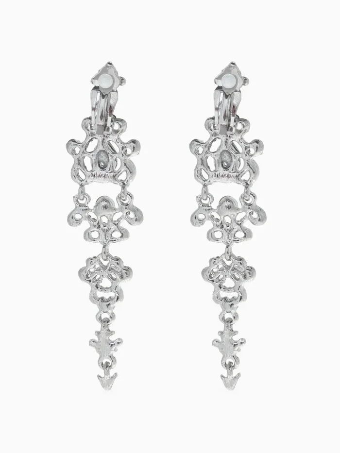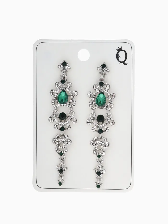 Клипсы для ушей висячие со стразами QF «Ажур», капли с завитками, цвет бело-изумрудный в серебре