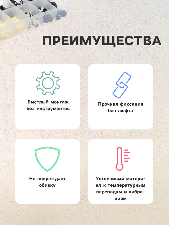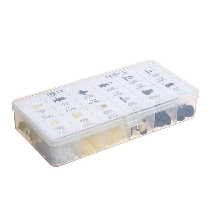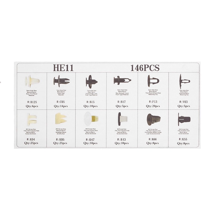 Клипсы и пистоны крепежные, 12 видов, набор 146 шт. — Характеристики