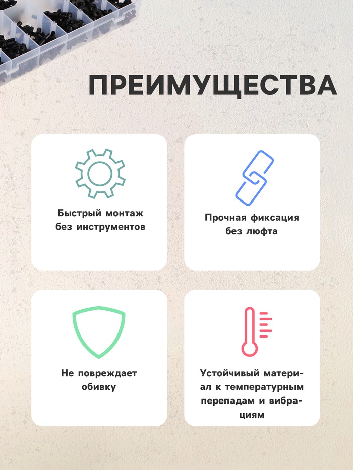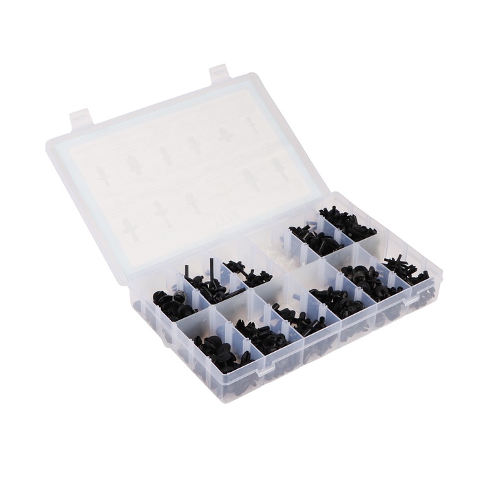 В транспортном средстве любая мелочь имеет значение. Не исключение крепежные клипсы и пистоны. На этих незаметных маленьких деталях из пластика держатся автомобильные молдинги, решетки радиаторов, бампера, обшивка салона, багажника, капота и дверей, декоративные элементы автоинтерьера, шумо- и теплоизоляция, уплотнители, порожки, коврики, облицовка околодверных стоек, подкрыльники, фары и многое другое. Учитывая важность этих деталей, Вы не можете оставить себя без такого набора!