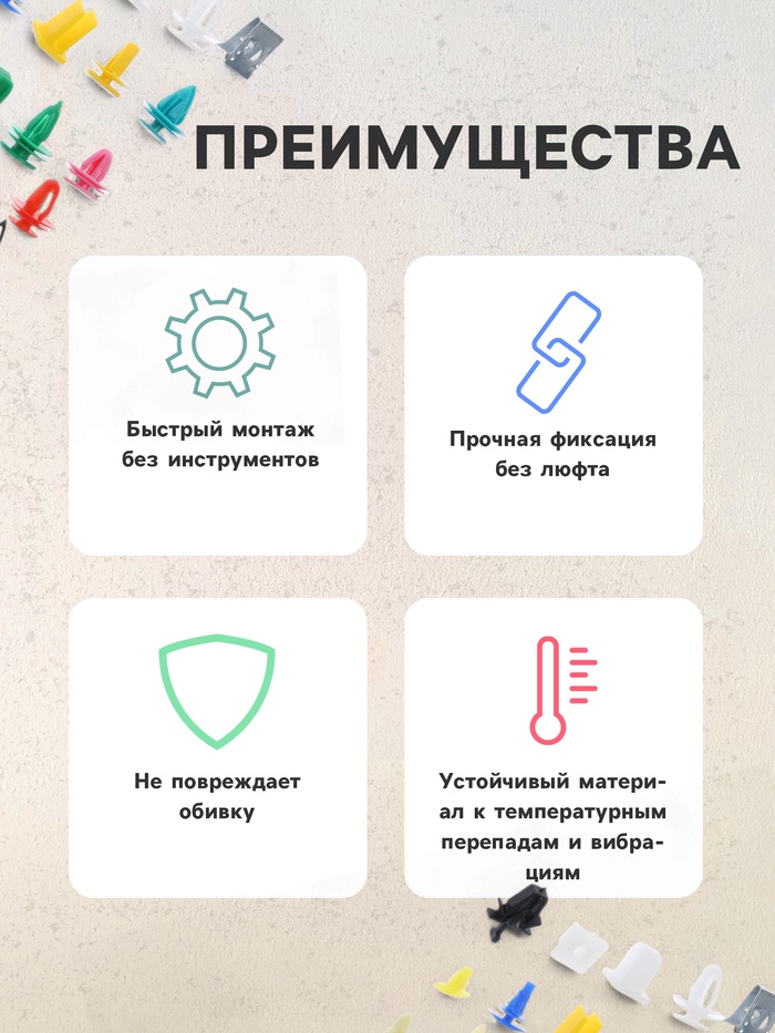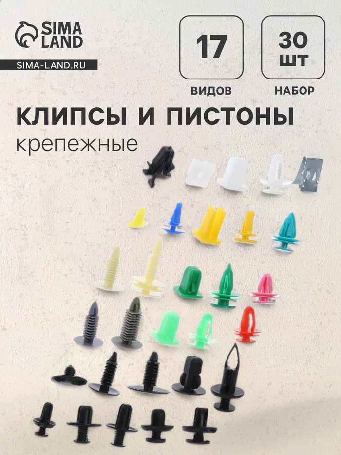 Клипсы и пистоны крепежные в наборе из 17 видов по 500 штук каждый - это незаменимый помощник для любого автолюбителя или мастера по ремонту автомобилей. Эти крепежные элементы используются для фиксации различных деталей автомобиля, таких как молдинги, решетки радиатора, бамперы и другие элементы кузова. Набор включает в себя различные размеры и формы клипс и пистонов, что позволяет подобрать оптимальный вариант для каждого конкретного случая. Благодаря высокому качеству материалов, из которых изготовлены крепежные элементы, они обладают высокой прочностью и устойчивостью к коррозии, обеспечивая надежное крепление деталей автомобиля на протяжении длительного времени.