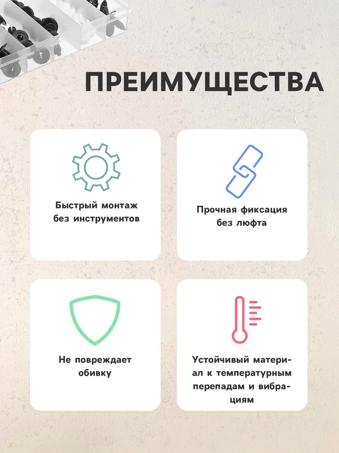 Клипсы и пистоны крепежные, 6 видов, набор 50 шт. — Характеристики