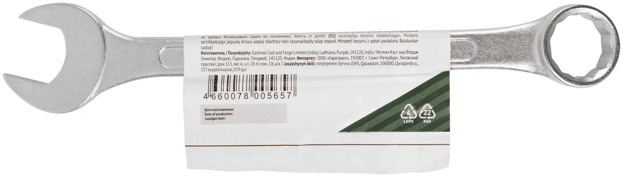 Ключ изготовлен из инструментальной стали, что обеспечивает высокую прочность и долговечность. Хромированное покрытие защищает инструмент от коррозии, продлевая срок его службы. Благодаря удобным габаритам (295x60x20 мм) ключ легко помещается в руку, обеспечивая комфортную работу.