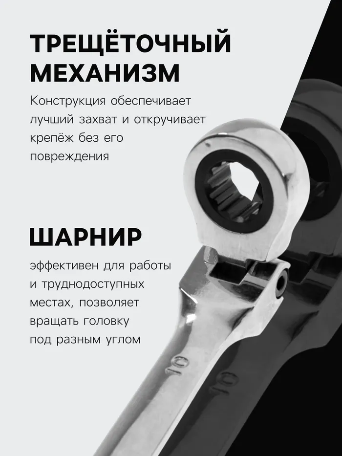 Ключ комбинированный трещоточный шарнирный ТУНДРА, CrV, полированный, 72 зуба, 10 мм — Характеристики