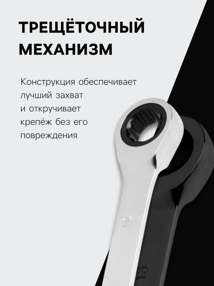 Ключ имеет две накладные головки: рожковую и трещоточную. Благодаря трещоточной головке с 72 зубьями увеличивается крутящий момент и возможные углы работы с крепежом.