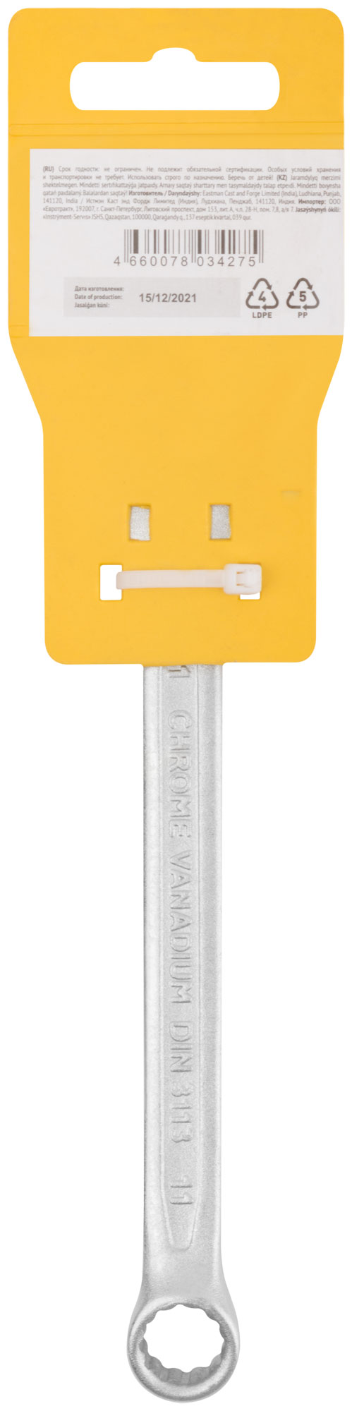 Ключ изготовлен методом холодной штамповки из хром-ванадиевой стали, что обеспечивает его долговечность и устойчивость к износу. Матовое хромированное покрытие защищает от коррозии, а стандарт DIN 3113 гарантирует высокое качество выполнения.