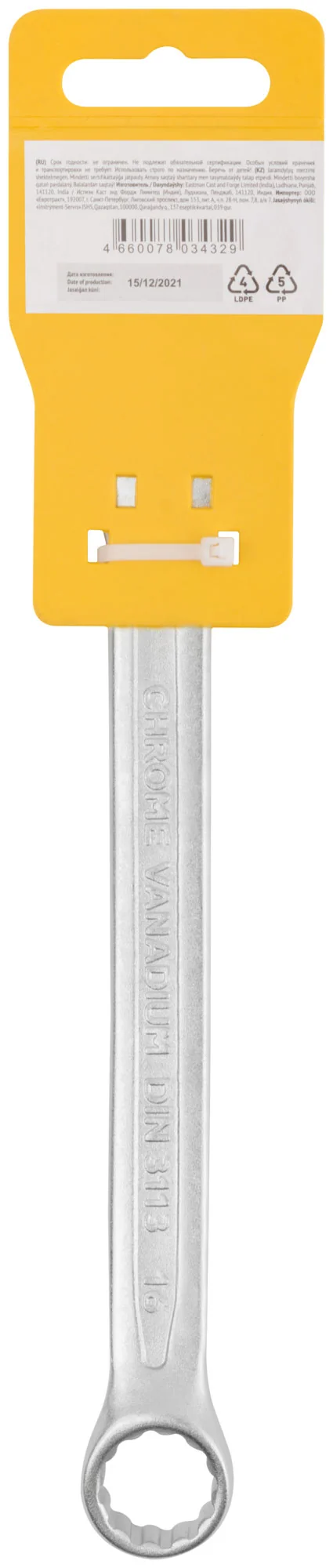 Ключ изготовлен из хром-ванадиевой стали с матовым хромированным покрытием, что обеспечивает его долговечность и устойчивость к коррозии. Применение метода холодной штамповки делает его особенно прочным и надежным в использовании.