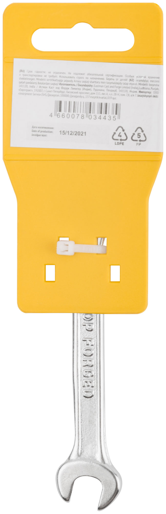 Ключ изготовлен из инструментальной стали с хромированным покрытием, что обеспечивает его долговечность и защиту от коррозии. Компактные габариты 120x50x5 мм и вес всего 40 г делают его удобным в использовании и транспортировке.