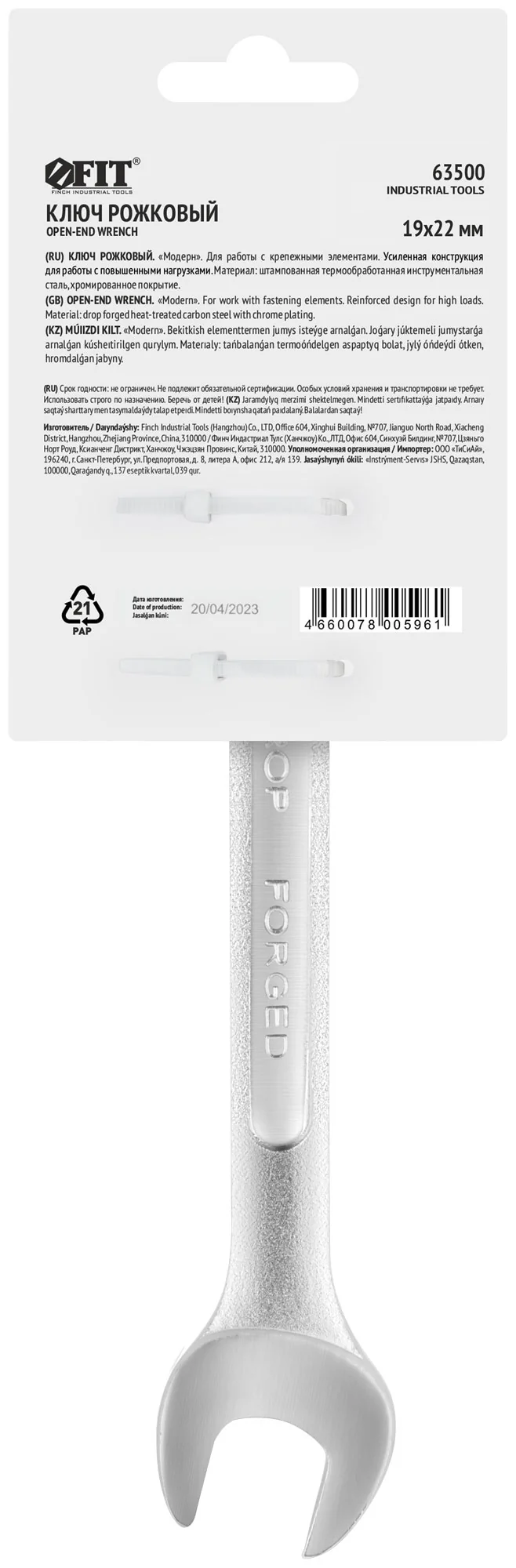 Выберите ключ рожковый "Модерн" 19х22 мм от FIT, чтобы обеспечить надежное и эффективное выполнение работ с крепежом.