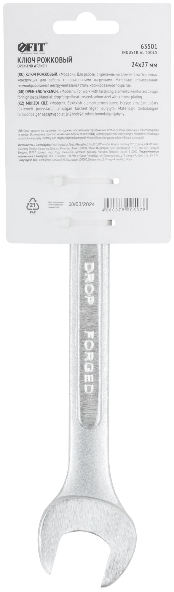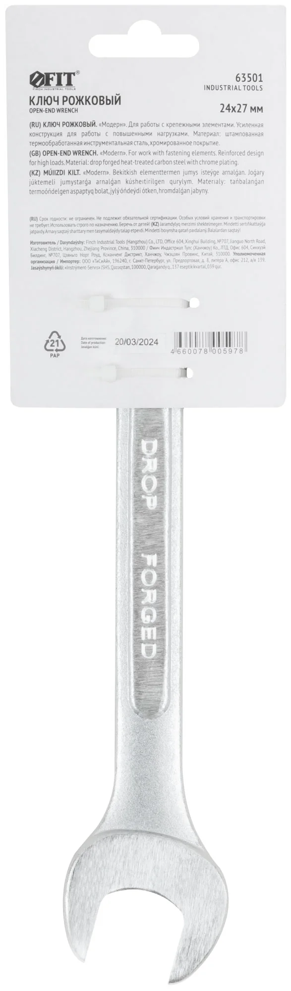 Выберите ключ рожковый усиленный "Модерн" 24х27 мм от FIT, чтобы обеспечить надежность и эффективность вашей работы. Арт. 63501.