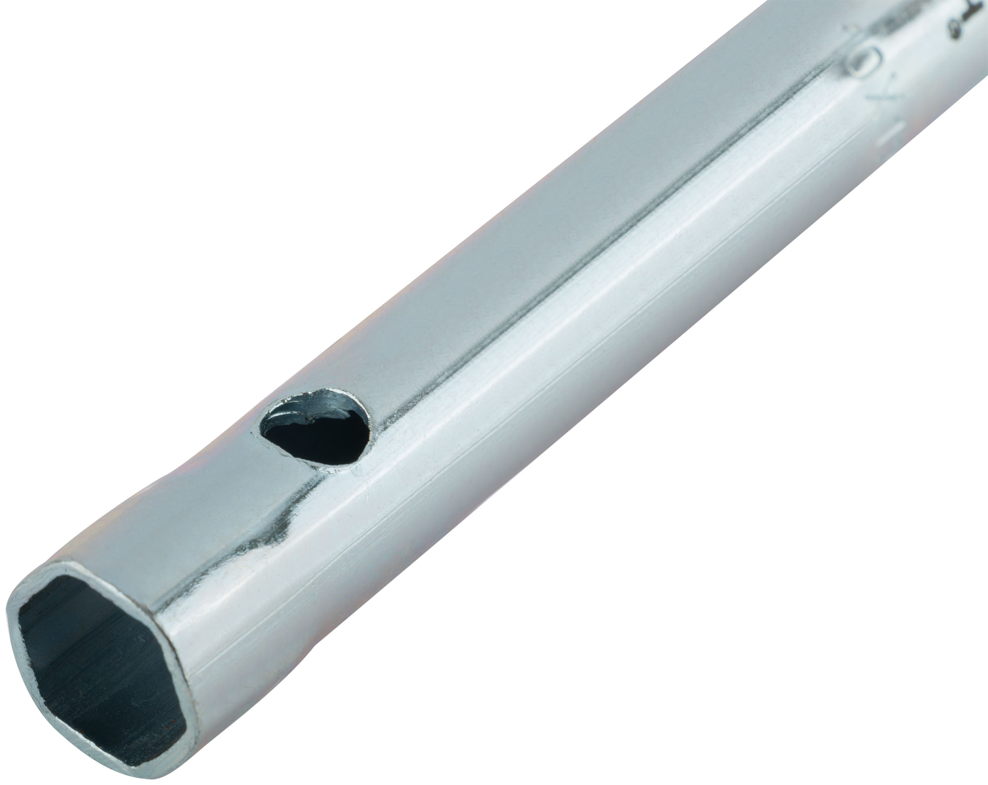 Ключ изготовлен из прочной инструментальной стали, что обеспечивает высокую долговечность и надежность в сложных условиях использования. Общая длина ключа составляет 130 мм, что позволяет работать в труднодоступных местах.