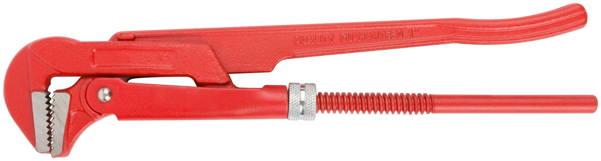 Ключ изготовлен из высококачественной инструментальной стали, что гарантирует его долговечность и устойчивость к износу. Шлифованные губки обеспечивают надежный и безопасный захват, а угловой тип 90° позволяет работать в труднодоступных местах.