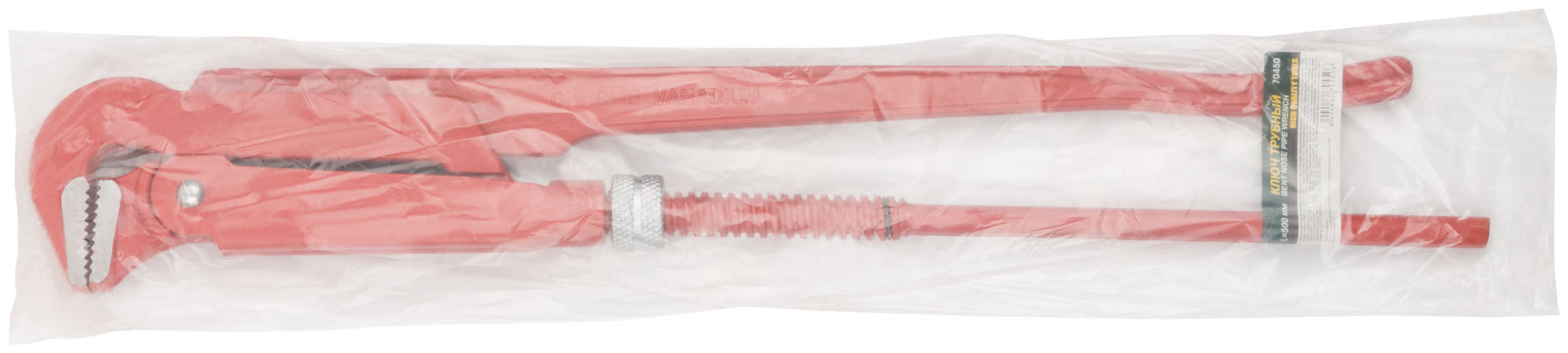 Преимущества ключа включают универсальный угол 90°, который делает его подходящим для различных задач в профессиональной среде. Ключ обладает размером 500 мм, идеально подходящим для работы с трубами диаметром до 2".