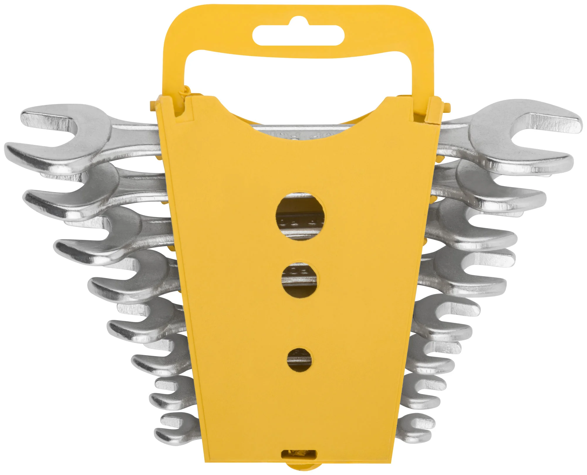 Набор включает 8 ключей с размерами 6 х 7, 8 х 9, 10 х 11, 12 х 13, 14 х 15, 16 х 17, 18 х 19 и 20 х 22 мм, что делает его универсальным инструментом для самых различных задач.