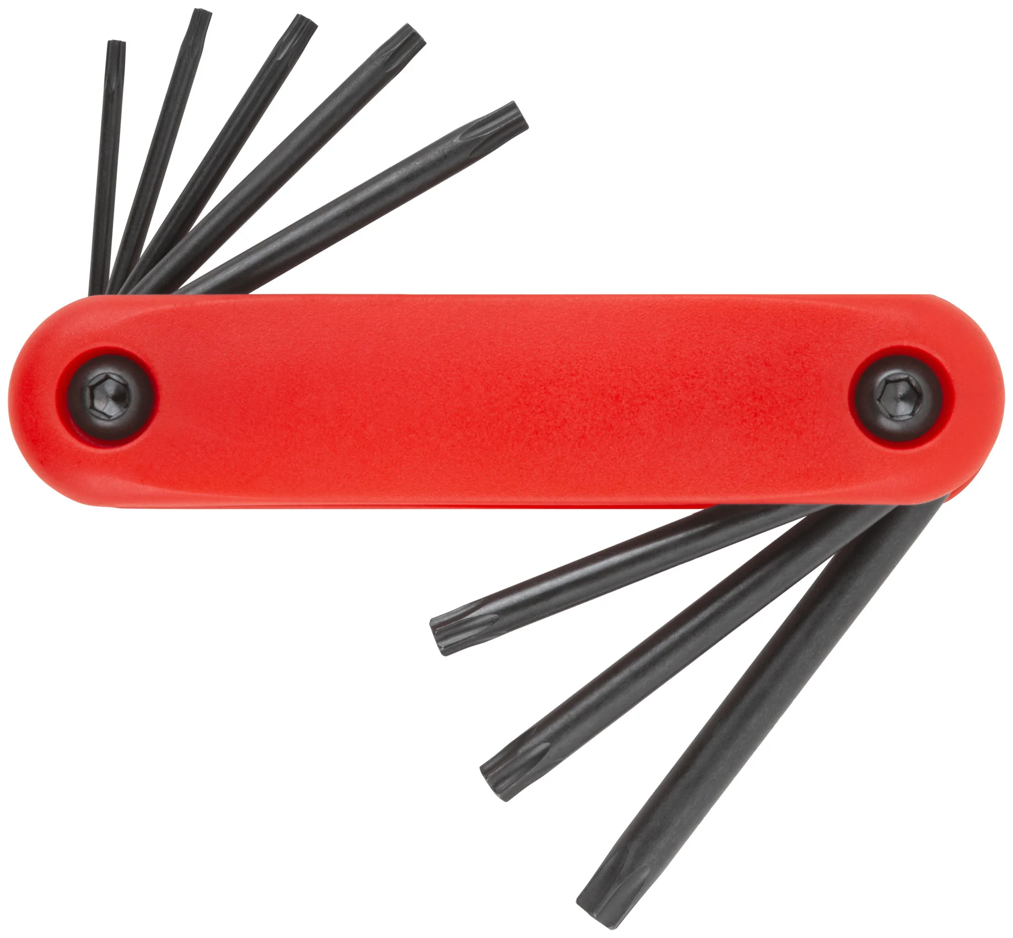 В набор входят 8 ключей TORX размеров от Т9 до Т40, выполненных из прочной хром-ванадиевой стали, что обеспечивает их долговечность и устойчивость к коррозии. Все ключи удобно размещаются в складном пластиковом держателе, который защищает их от повреждений и облегчает транспортировку.