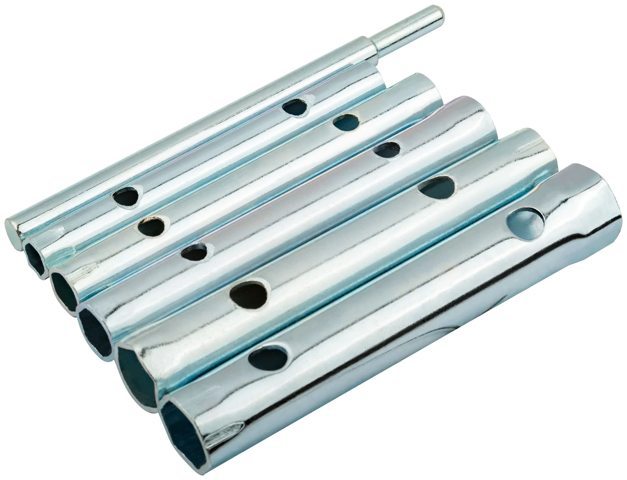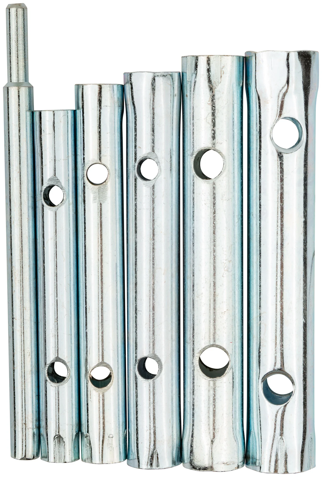 В комплект входят двусторонние трубчатые ключи, изготовленные из инструментальной стали, что обеспечивает высокую прочность и долговечность. Каждый ключ в наборе имеет два рабочих конца, что увеличивает его функциональность.