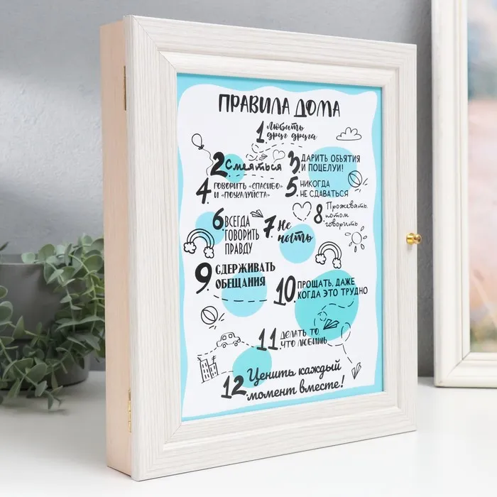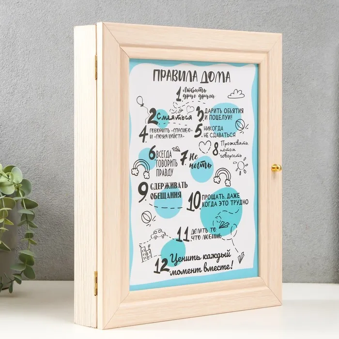 Представляем стильное решение для хранения ключей и мелочей, которое станет не просто функциональным аксессуаром, но и ярким элементом декора вашего дома. Это закрытая ключница с семью крючками, украшенная тематикой «Правила дома», идеально впишется в любой интерьер, добавляя нотку уюта и порядка.