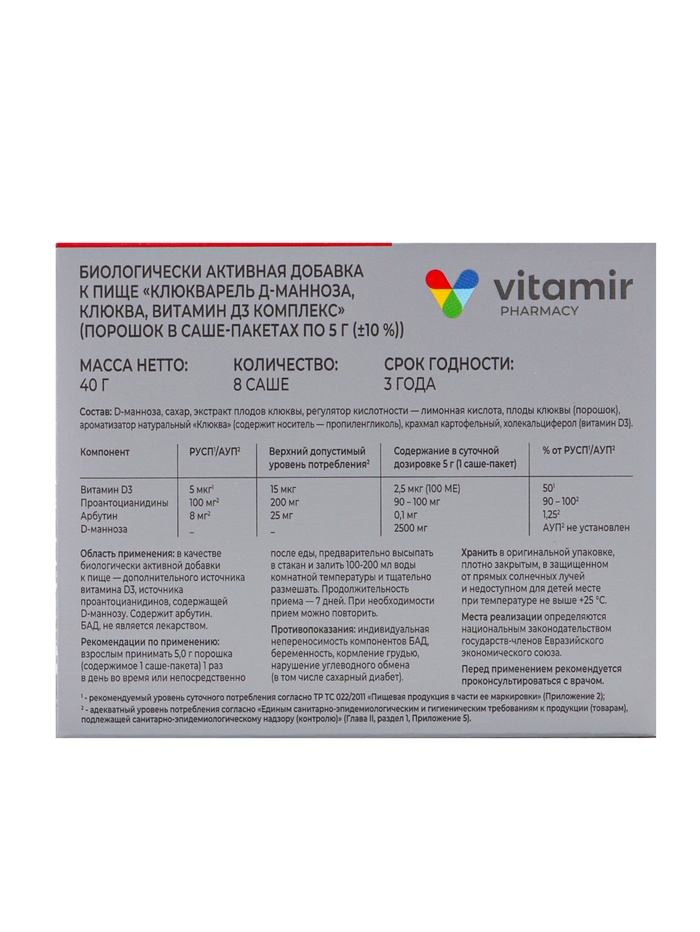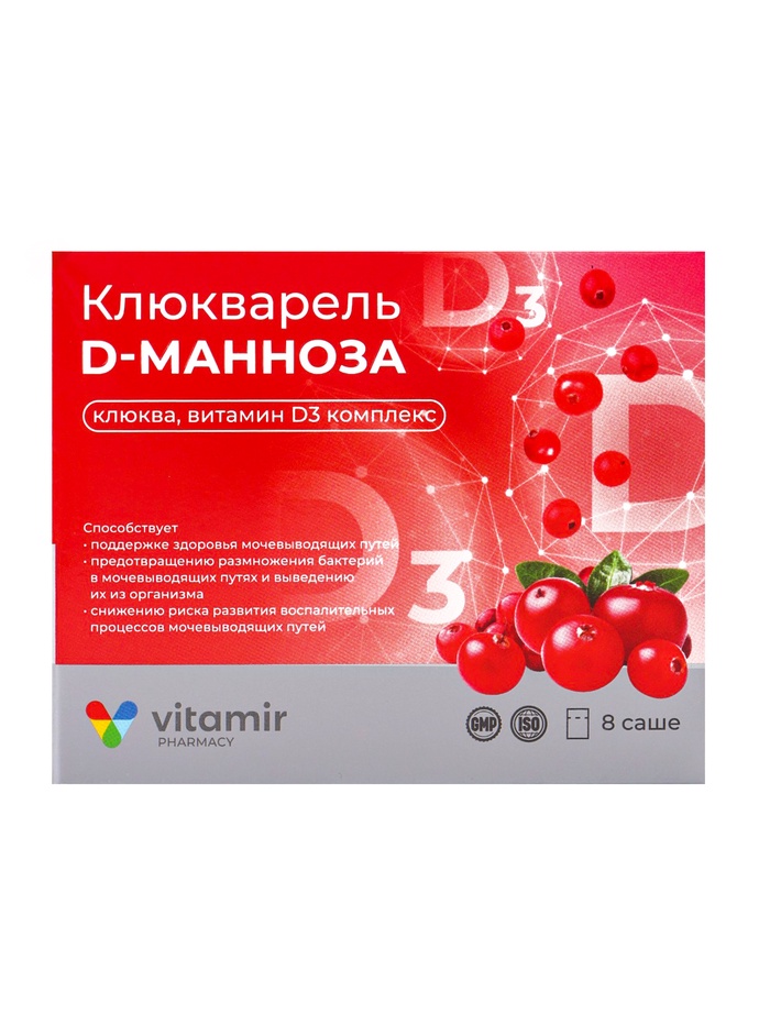 Клюкварель с Д-маннозой «Витамир», для здоровья мочевыводящих путей и профилактики инфекций, 8 саше — Характеристики