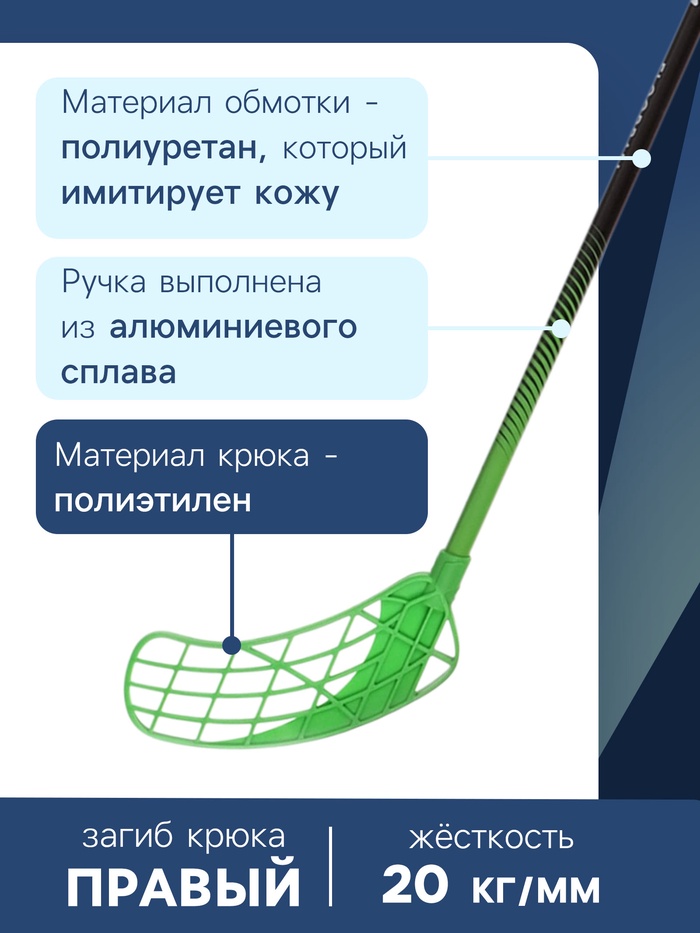 Клюшка для флорбола ONLYTOP, взрослая, левый хват, 100 см, жёсткость 20 кг/мм, цвет зелёный — Характеристики