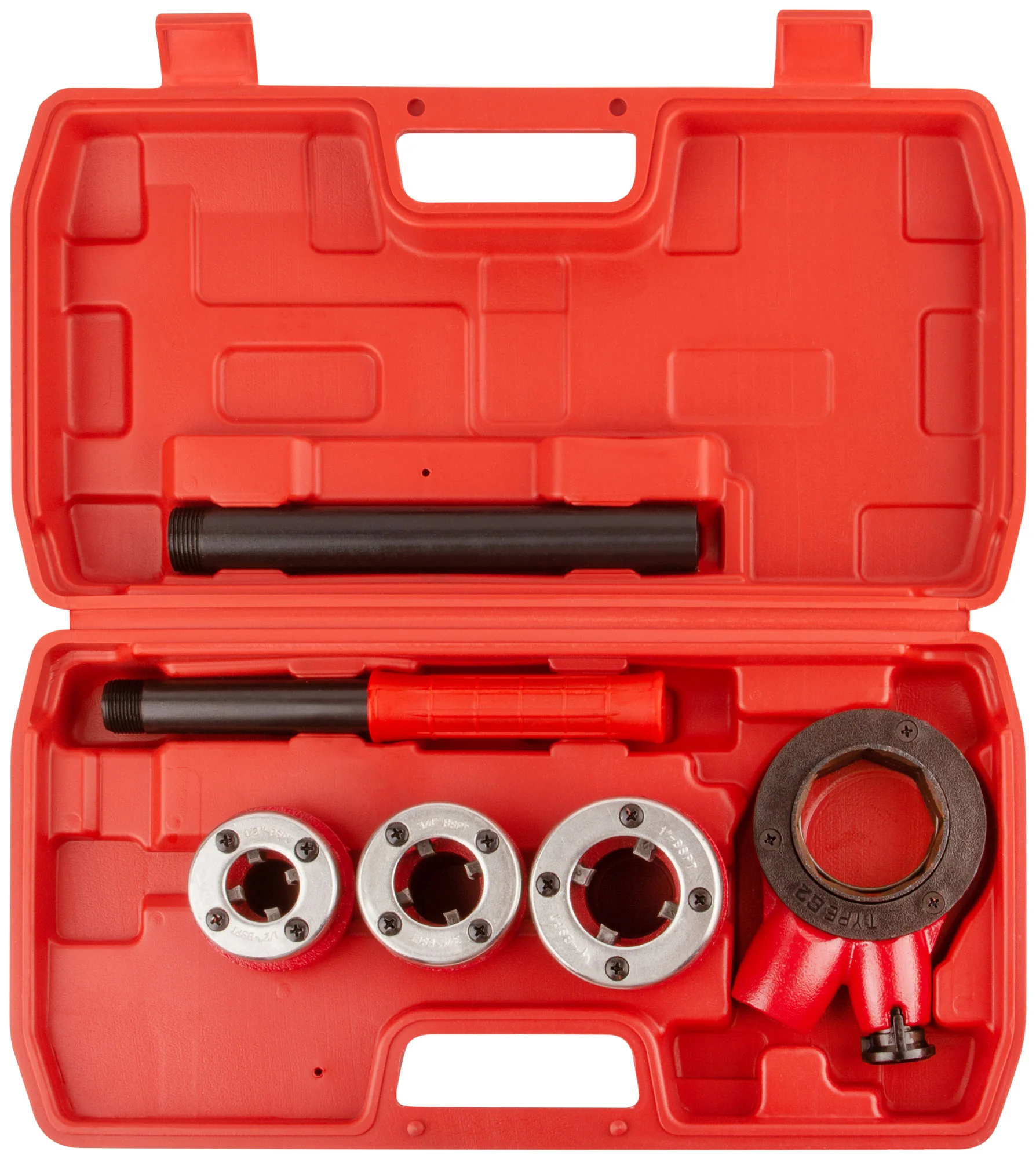 В состав набора входит три клуппа с типоразмерами 1/2", 3/4" и 1", что позволяет работать с трубами различного диаметра. Изготовлены из инструментальной стали с хромированным покрытием, что обеспечивает долговечность и износостойкость. Корпус из высококачественного чугуна гарантирует надежность конструкции, а резцы из легированной стали обеспечивают точную резьбу.