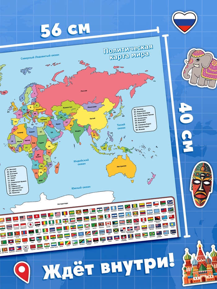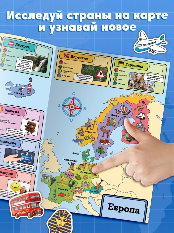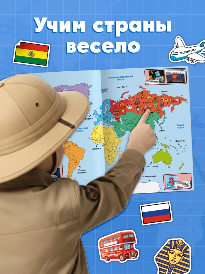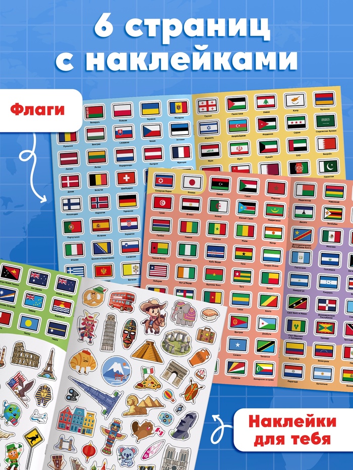 Эйфелева башня в Париже, пирамиды в Египте, кенгуру в Австралии — каждая наклейка становится поводом узнать, как живут дети в другой части света, на каком языке они говорят и во что играют. А большой плакат превращается в домашнюю карту приключений, которую можно вешать на стену и дополнять годами.